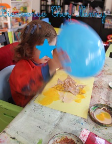 Lou est arrivée ce matin avec un petit ballon et cela m’a donné une idée pour notre atelier peinture autour de la feuille d’automne.
