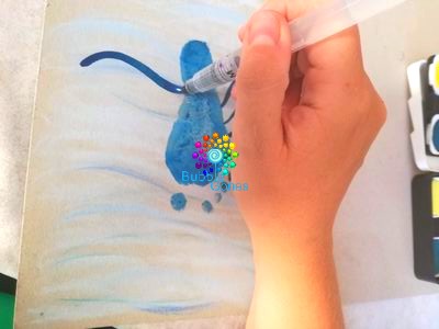 L’empreinte sèche assez rapidement, je dessine les tentacules en traçant deux trais d’aquarelle dont un dilué.