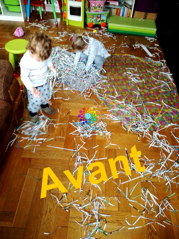 Je fais un peu le même style d’activité en gardant les papillons qui protègent le contenu des colis. Mais ton idée de papier déchiqueté me plait beaucoup car ça me permettrait de camoufler plus de chose. Et mon fils aurait plus de matière à farfouiller. L’achat d’une déchiqueteuse est en plus un projet, donc je vais pouvoir tester tout ça prochainement.