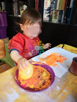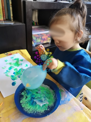 Miss L et Mademoiselle A ont tamponné les tâches de peinture avec les ballons.