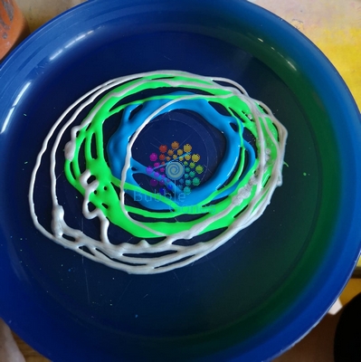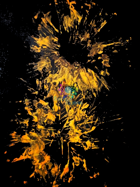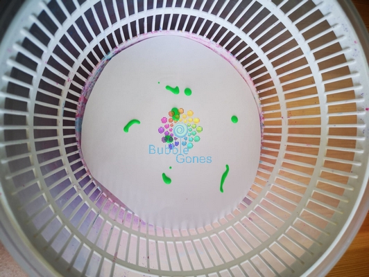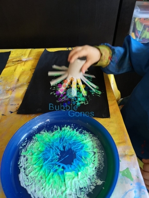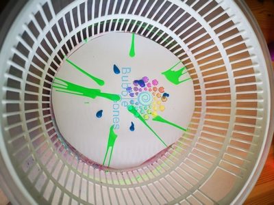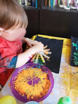 Pour ce feu d’artifice, il n’y a rien de plus simple. Il suffit de déposer des gouttes de peinture au centre de la feuille et de tourner l’essoreuse. Le rendu est simplement magique !