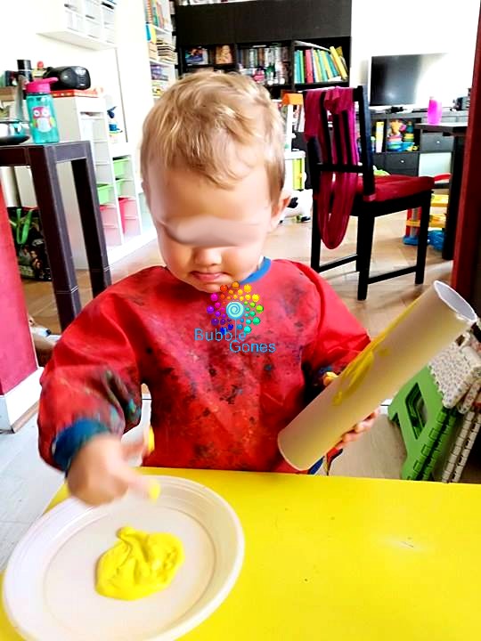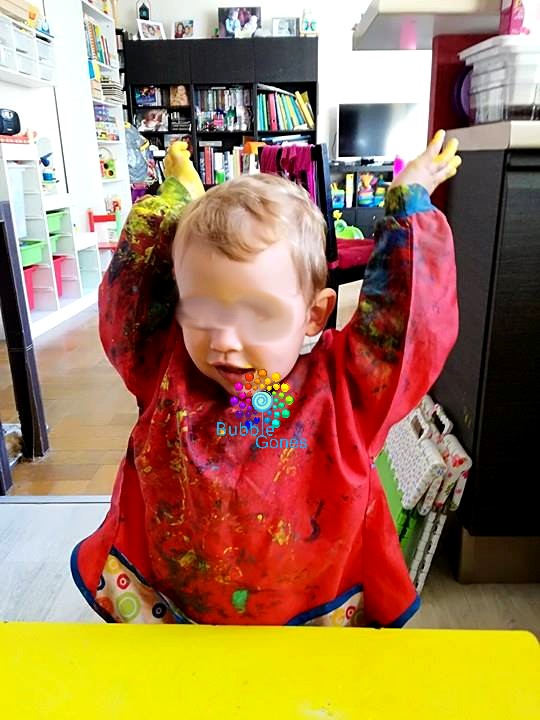 Hugo et Jeanne ont mis leur tablier, hyper impatients de découvrir ce que j’avais inventé ! J’ai déposé la peinture dans l’assiette, je leur ai donné les rouleaux et là je leur ai expliqué qu’ils allaient peindre sans pinceau, allez hop la main entière dans la peinture !
