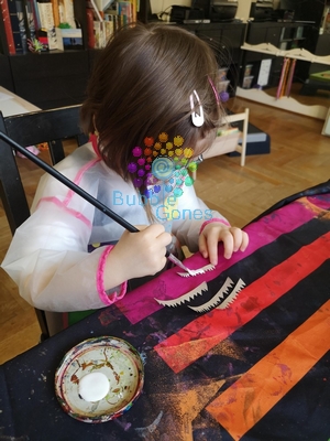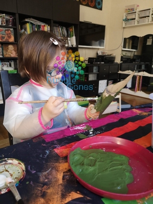 J’ai mélangé du vert avec du marron pour essayer d’obtenir un vert crocodile (je vois pas trop comment l’appeler autrement). Mademoiselle A a d’abord peint le corps du crocodile puis les pattes et les quelques chutes afin de réaliser les crètes sur la colonne. Puis elle a peint les dents en blanc.