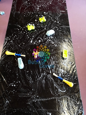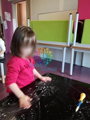 Il faut d’abord protéger votre table basse en la recouvrant entièrement avec un sac poubelle que vous scotcher sous la table. Puis vous versez du gel douche sur toute la surface et un coup de pschitt d’eau. L’enfant ne voit pas trop ce qu’il y a sur la table, ainsi vous lui demandez de caresser la surface avec ces mains.