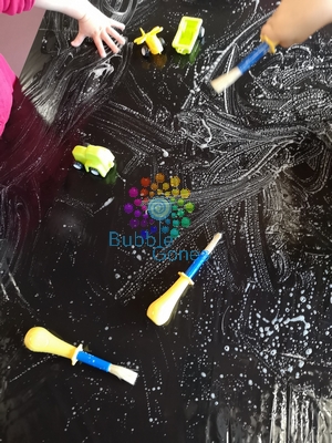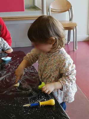 Peu à peu, la mousse va se former sous ces mains et la joie apparaît. Vous pouvez lui donner alors une éponge, des pinceaux, des petites voitures, ainsi il va pouvoir dessiner dans cette mousse.