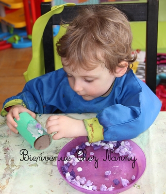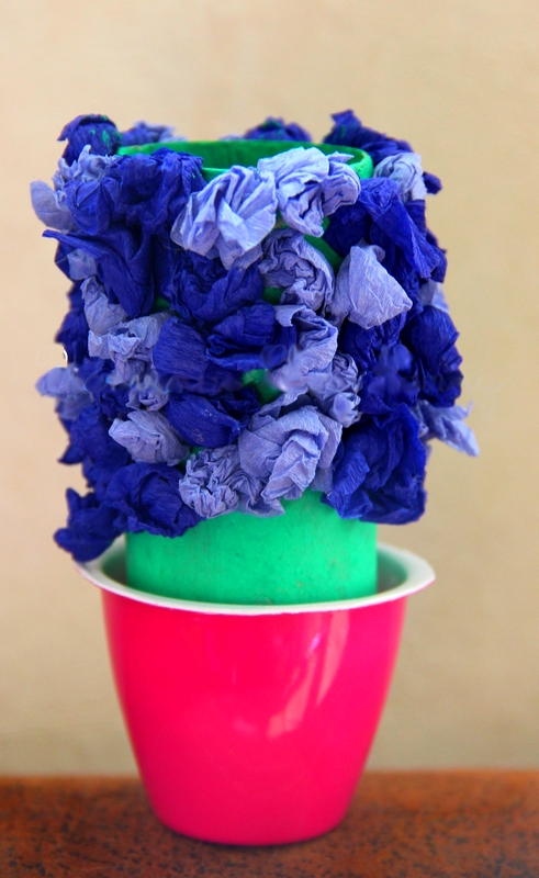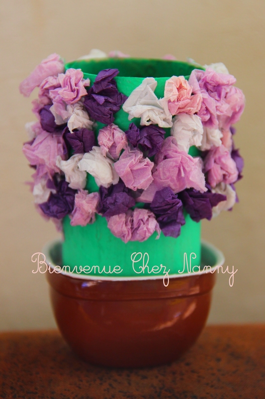 Puis j’ai encollé le pot et les filles ont collé les boulettes de papier crépon dessus.