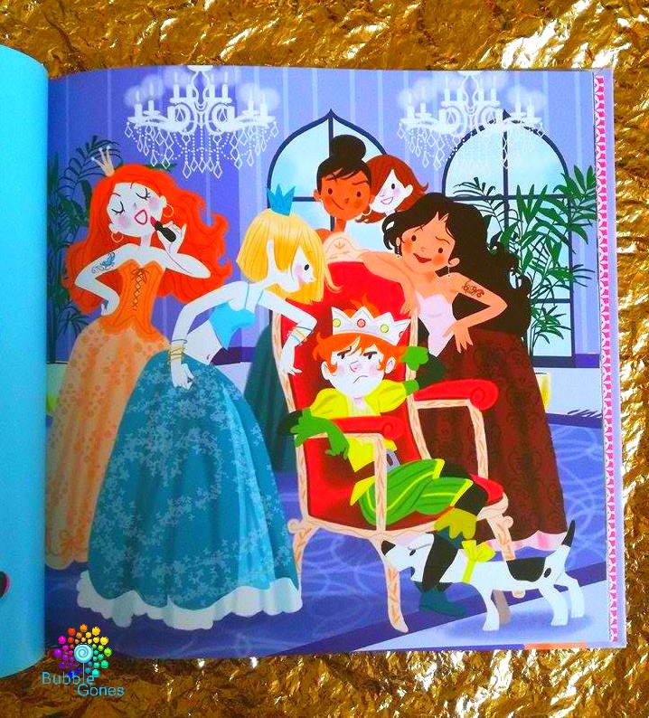 Mais on a un vocabulaire riche et un peu nouveau avec des belles expressions “trouver chaussures à son pied ” (ça a bien fait rire mes filles ce petit clin d’oeil à Cendrillon), des mots un peu nouveaux : bling-bling avec des princesses à la mode : tatouage, maquillage, faux ongles, percing… On est très loin de l’image parfaite des contes de fée.