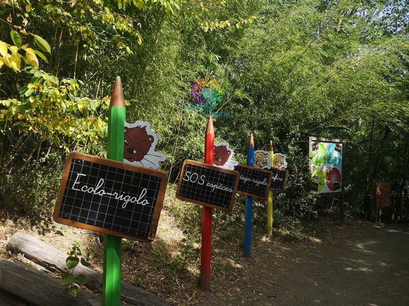 Nous découvrons des grands parkings à l’ombre (avec les panneaux photovoltaïques), aucun souci pour trouver une place à l’abri : le plus dur étant de choisir. Trois minutes après nous entrons dans le parc. Le masque est obligatoire dans les lieux clos (toilettes, enclos immersif, serre…). Après un passage aux wc (présent dès l’entrée), nous suivons le chemin le long de l’étang. Nous découvrons les différents panneaux pédagogiques qui seront présents tout au long de notre parcours.