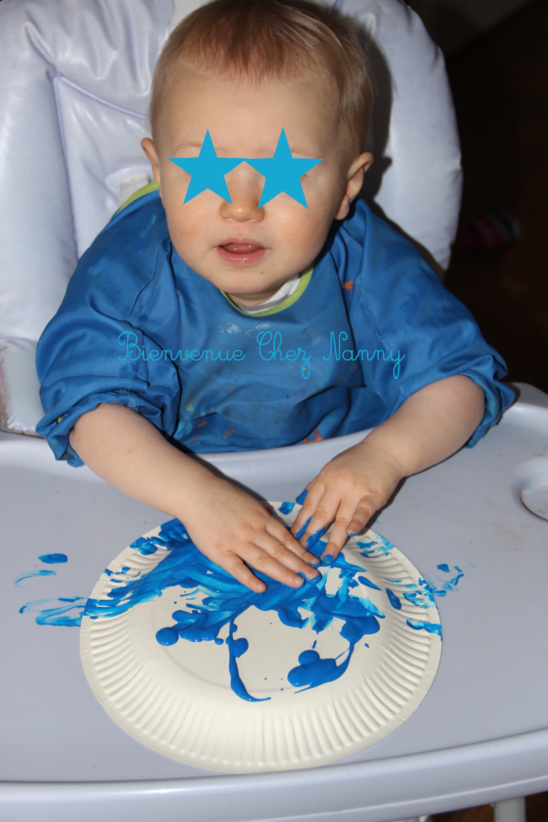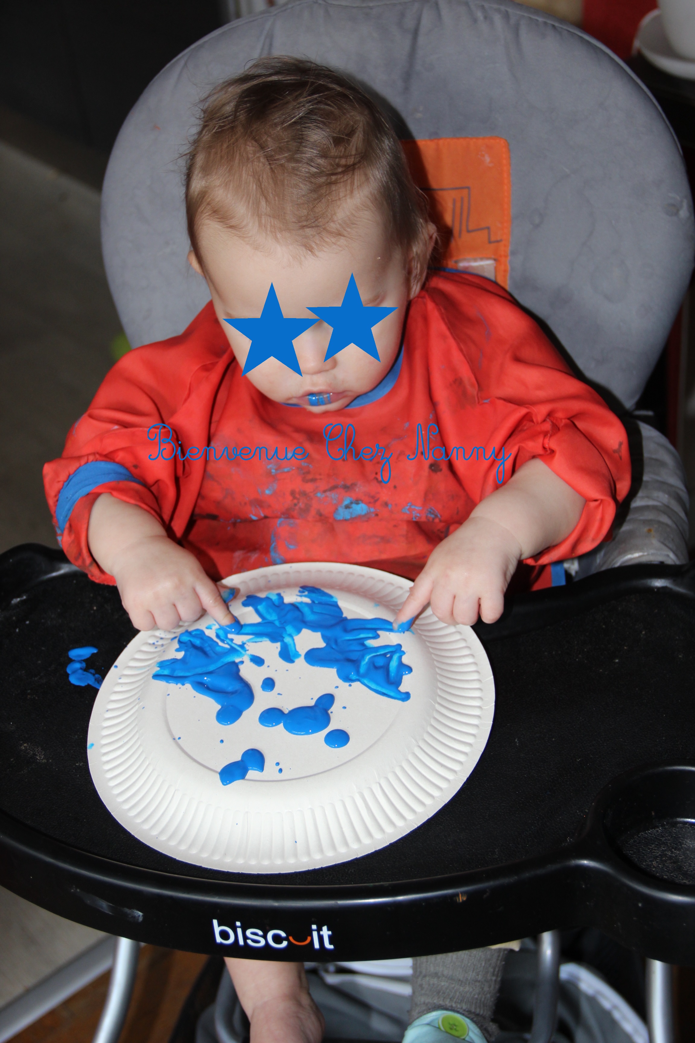 J’ai installé mes deux loulous dans leur chaise haute avec eur tablier. Puis j’ai déposé des gouttes de peinture sur l’assiette en carton et je l’ai donné aux loulours. Jeanne et Hugo ont étalé la peinture avec leurs mains. Jeanne a maintenant bien compris le truc et elle y va à pleines mains. Hugo a fait son coquinou et il a trempé son doigt dans la peinture et a déposé l’empreinte de son doigt…. …. sur la tablette !!!