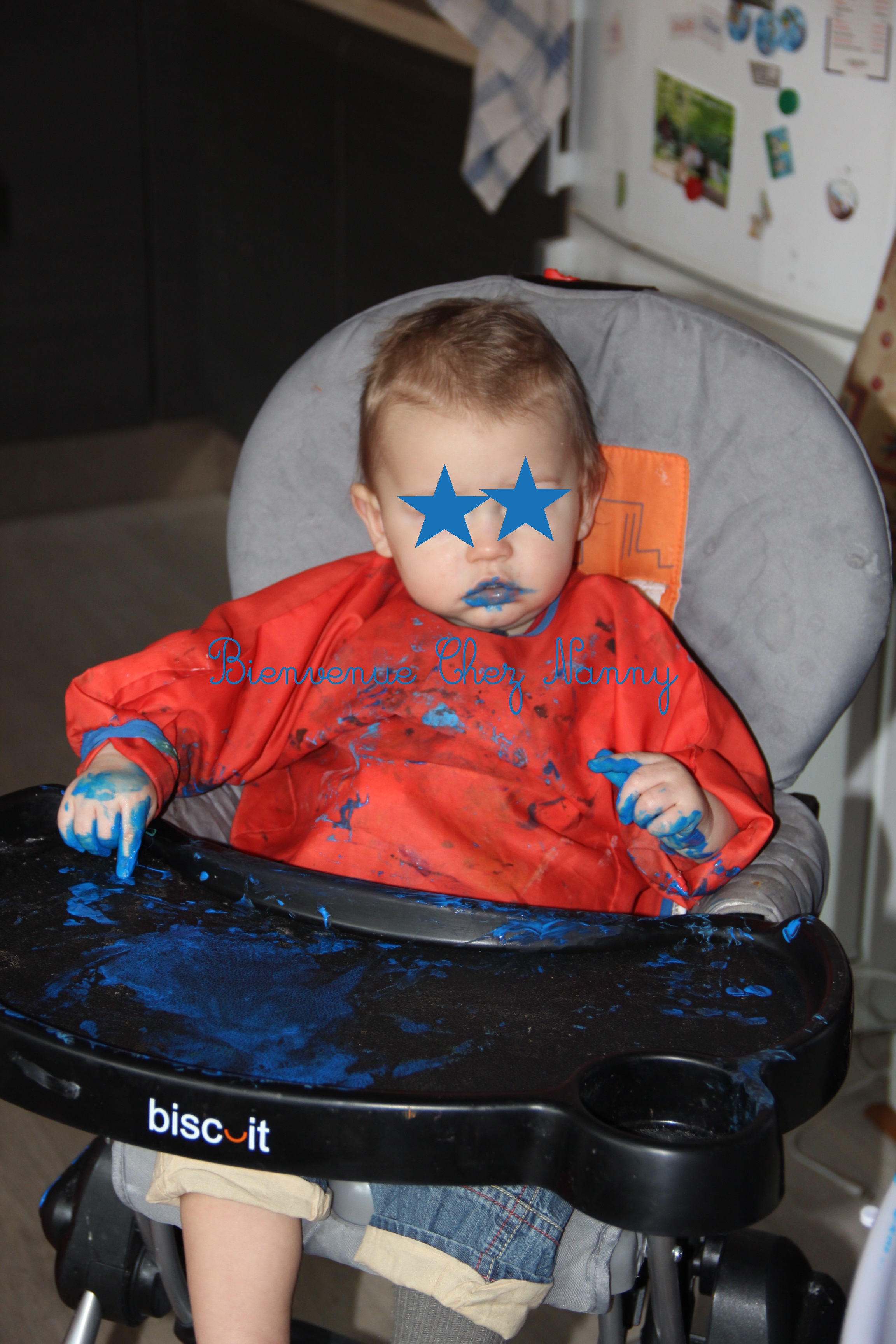 Très rapidement ils ont étalé la peinture partout, mais quand je dis partout, c’est partout : assiette, tablette, mains, bouche, visage, cheveux … … Ils ont fait un remake de Braveheart ! En tout cas, ils se sont bien amusés : c’est le principal.