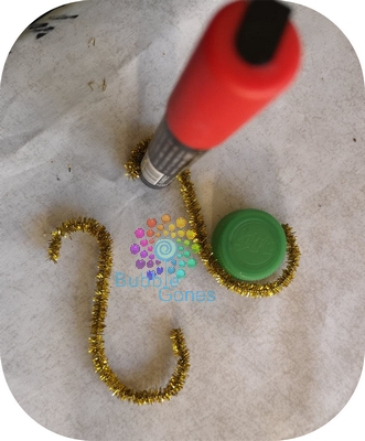 Mais il manque encore un petit détail sur la coupe : les anses. Pour cela rien de plus simple : un cure pipe or coupé en deux que j’enroule autour d’un bouchon et d’un feutre pour lui donner la forme.