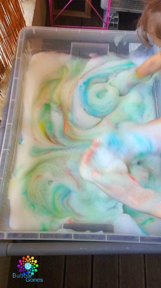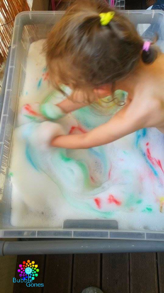 Je verse au fur et à mesure dans le grand bac la mousse ainsi obtenue. Je remplie à moitié le bac. Pour un effet encore plus fun, j’ai déposé quelques gouttes de colorant :