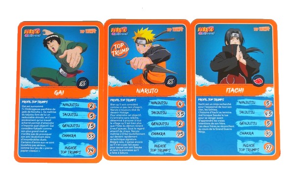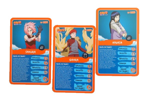Dans le jeu de cartes, on retrouve les personnages clefs de ce manga : Naruto qui est le Top Trump, Sasuke, Itachi, Kakashi, ainsi que des rivaux ou des ennemis : Rock Lee, Orochimaru.