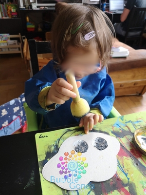 J’ai imbibé un tampon rond d’eau et les filles ont tamponné le nuage.