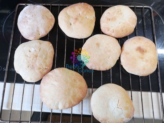 Ces petits pains gonflent légèrement et se creusent. Ils peuvent être fourrés afin d’être dégustés. Avec cette recette, j’ai pu réalisé 8 pains pita. A savoir qu’un par personne suffit pour le diner. Vous pouvez aussi les couper en 4 pour l’apéro. Car vous pouvez les fourrer avec plein de choses.
