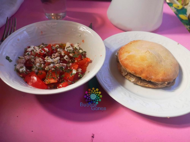 Pour le diner, j’ai ouvert les pitas et fait réchauffer quelques minutes à 120°C. J’ai rempli le pain pita avec le caviar d’aubergine. J’ai accompagné ce pain fourré avec une salade de tomates/feta.