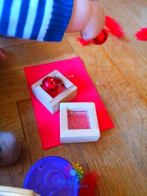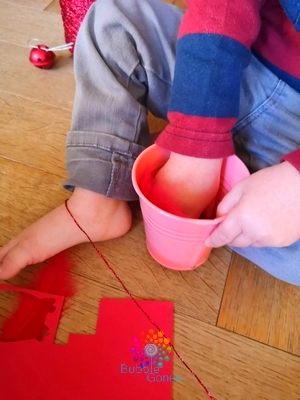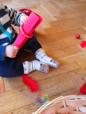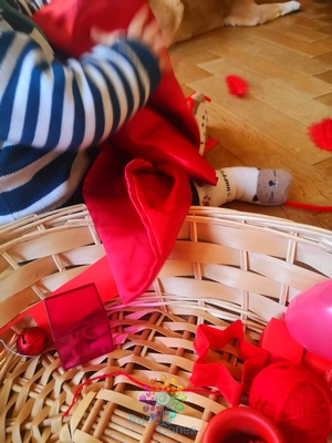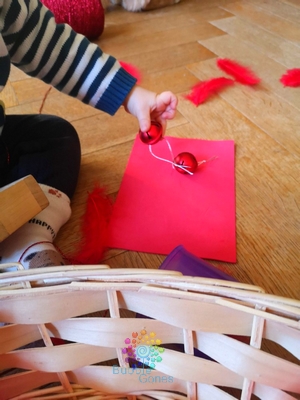 Pour Noël, je leur ai proposé un panier autour des décorations du sapin. J’y ai mis des guirlandes, des boules… Les loulous ont bien adoré.