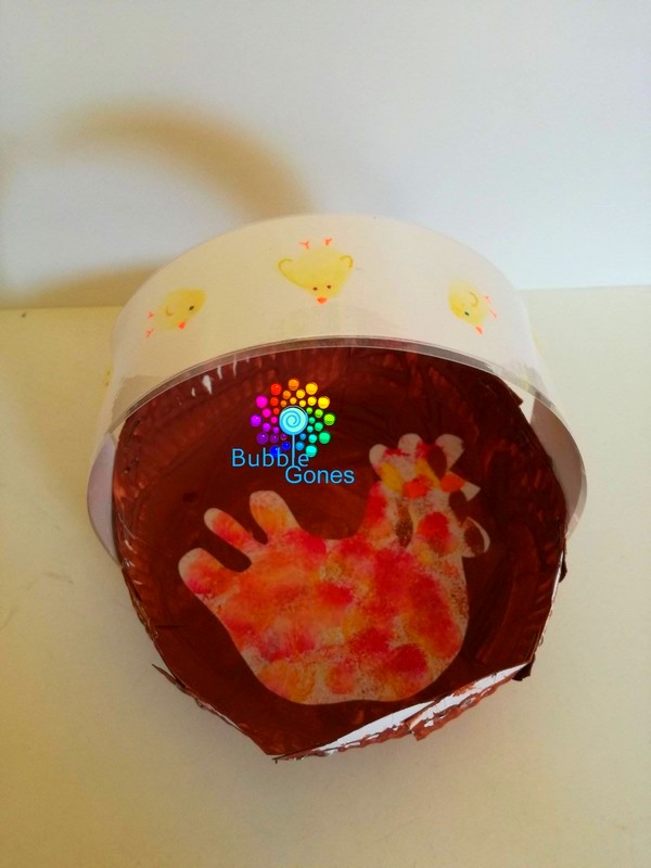 J’ai emprunté leur pouce pour dessiner de jolis poussins sur une bande de papier qui se transformera en l’anse du panier. Pour que l’empreinte du doigt se transforme en pioupiou, il suffit de rajouter les yeux, les pattes et un bec :