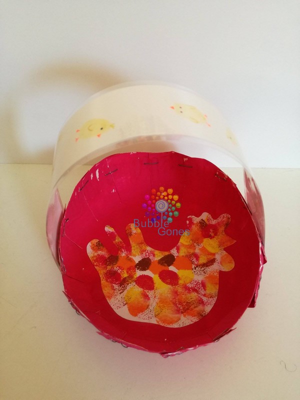 Pour transformer l’assiette en panier, c’est très simple. J’ai réalisé des découpes tous les 3/4 cm sur le tour de l’assiette. Pour la longueur des découpes, j’ai découpé jusqu’à la démarcation du centre de l’assiette en carton. Puis j’ai agrafé chaque encoche ensemble pour obtenir le fond du panier. J’ai collé la poule sur le fond du panier avec du vernis colle histoire que cela soit solide. Il ne reste plus qu’à agrafer l’anse sur le rebord des paniers.