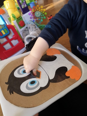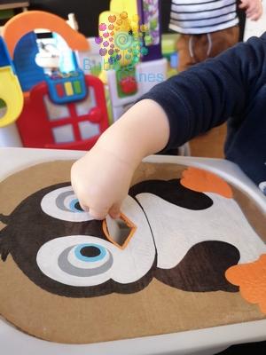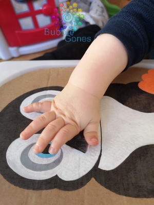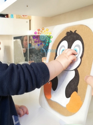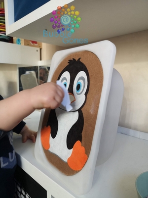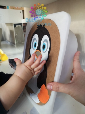 J’ai découvert les plateaux ludiques à positionner sur des bacs trofast, ainsi les enfants peuvent insérer des objets dans différentes fentes. Afin de créer mon nouveau plateau sur le thème de l’hiver, j’ai choisi le pingouin.