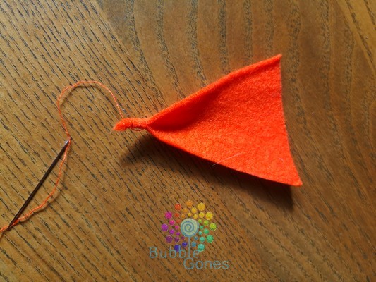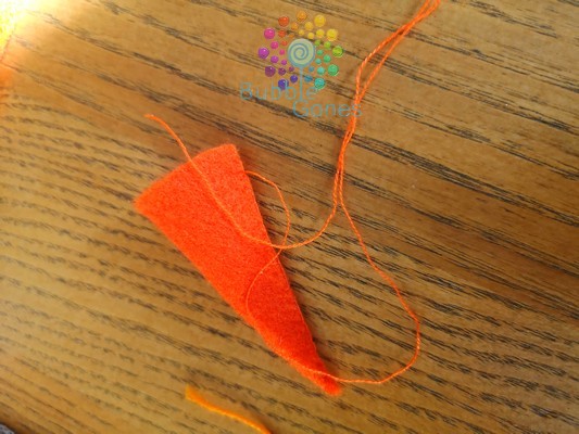 J’ai bourré ma future carotte avec de l’ouate. J’ai refermé le haut avec de la feutrine verte pour faire les fanes de la carotte.