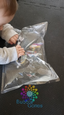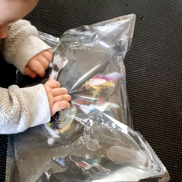 Quel est l’intérêt des pochettes sensorielles : l’enfant se rend compte des conséquences que son geste a sur la pochette : bruit, déplacement des poissons, bulles, applatissement de la pochette. Ces sens (vue, toucher et ouie) sont stimulés par ces mouvements. BBL a tout de suite accroché avec les pochettes.