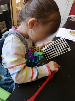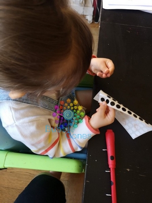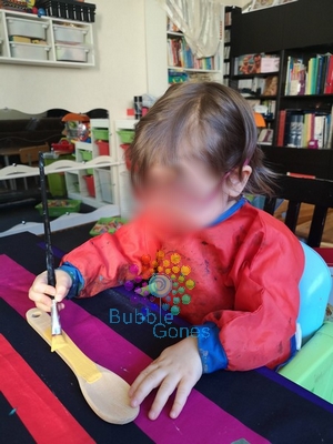 Puis elle a collé des gommettes noires sur le manche de la cuillère.