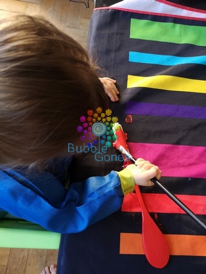 Pour réaliser les rayures de l’abeille, j’ai déposé des bandes de scotch pour que la miss puisse peindre les rayures en noire