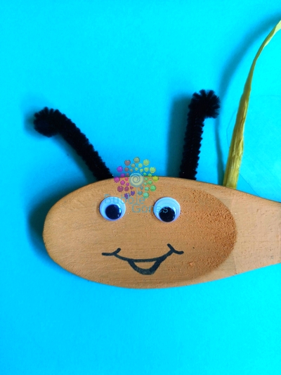 L’abeille ayant des ailes, j’en ai découpé dans du papier transparent et on les a collé derrière la cuillère. J’ai découpé le ruban que j’ai collé à l’arrière de la cuillère pour le suspendre.