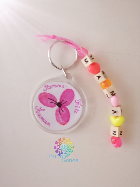 Nos clefs ? Oui c’est ça ! Pour que Dorothée la maman de Lou est toujours sa fille près d’elle, j’ai proposé à Lou de réaliser un porte clef. J’ai donné à Lou les lettres pour écrire MAMAN et les autres perles. Lou a enfilé les perles sur un fil de scoubidou :