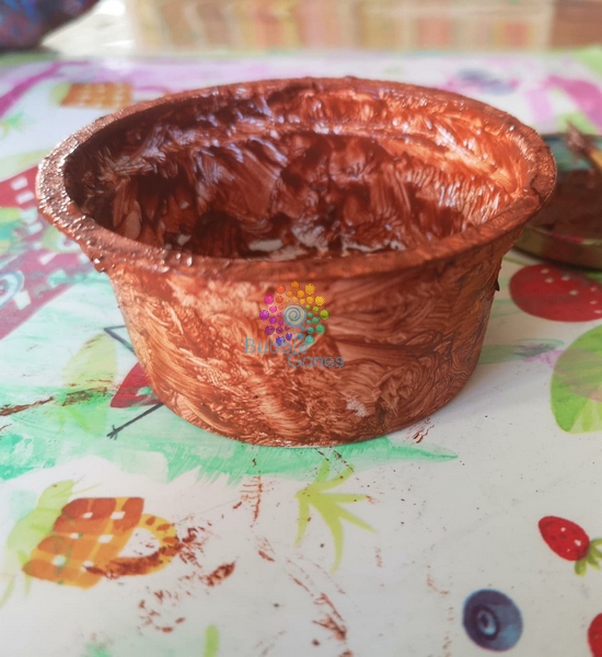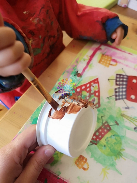 Les filles adorent peindre, et souvent elles en demandent encore après l’activité. Du coup j’ai un stock de feuilles déjà peintes. J’ai recyclé une ancienne peinture comme fond pour la carte. J’ai bombé un petit pot que Miss L a peint : je l’ai ensuite découpé en deux pour avoir deux moitié de pots.