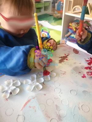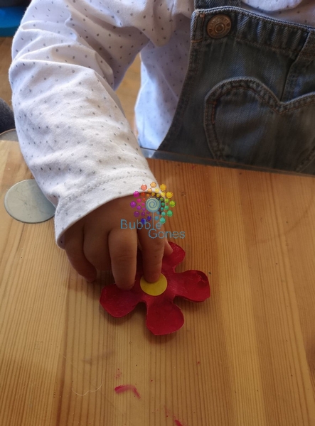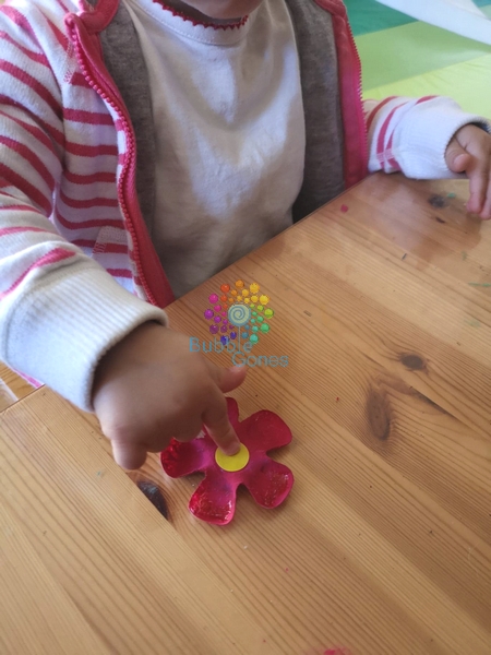 Une fois les fleurs sèchent, les filles collent les gommettes au centre de celle-ci :