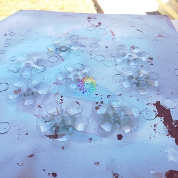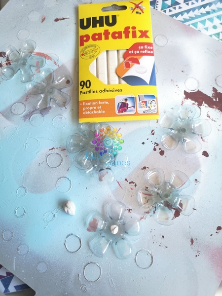 Comme la peinture n’adhère pas sur le plastique, je les ai bombé avec de la sous couche blanche. Petit conseil, afin que les fleurs ne volent pas sous l’effet de la bombe, je les ai maintenues sur ma planche avec de la pâte à fixe :