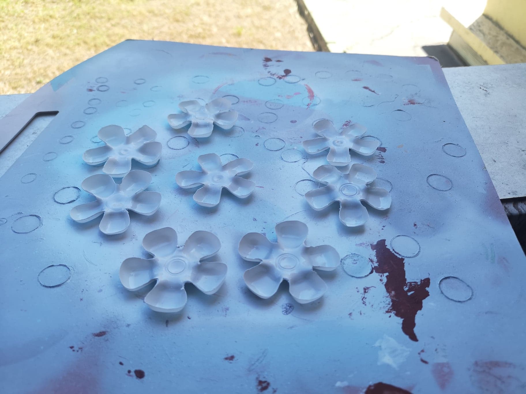 J’ai découpé le cul des petites bouteilles en suivant le dessin du fond afin de former une fleur avec des pétales :