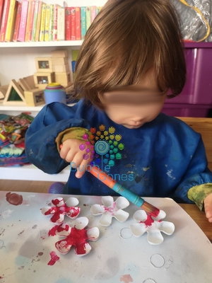 Une fois les fleurs sèchent, Mademoiselle A et Miss L les ont peint. Pour la même raison que précédemment, les fleurs étaient collé avec la pâte fixe sur la planche pour que les filles puissent les peindre sans qu’elles bougent dans tous les sens: