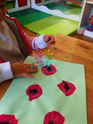 Puis elles ont posé leurs mains sur la feuille pour réaliser de jolis coquelicots. Elles ont ensuite collé des gommettes d’insectes.