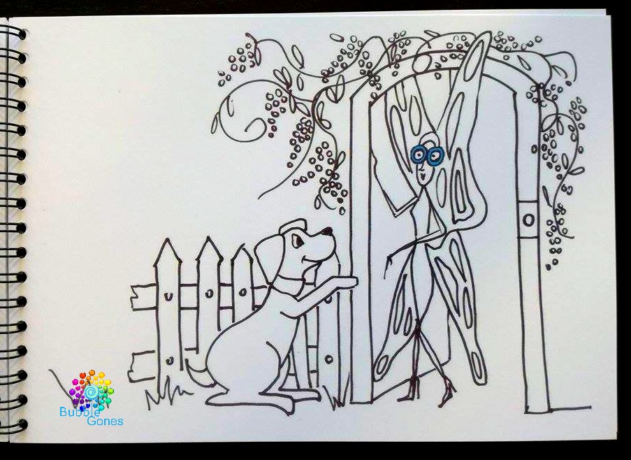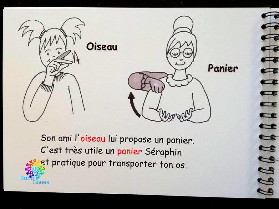 La page de gauche est un peu de texte avec un voire deux mots en rouge : ceux sont les mots que l’on va apprendre en LSF, une petite fille ou une grand-mère nous montre la gestuelle à effectuer. La page de droite est l’illustration du texte.