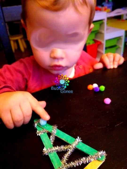 J’ai collé le bout du cure-pipe sur le bas du sapin. Puis l’un après l’autre en écoutant mes instructions, Hugo et Jeanne ont passé leur guirlande entre les branches du sapin.