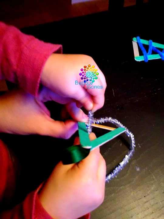 J’ai coupé un bâtonnet en deux pour former le pied du sapin. Puis j’ai collé les trois bâtonnets ensemble avec le ruban en haut
