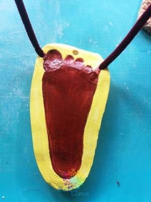 En 48h, la pâte était bien sèche. J’ai d’abord peint en marron l’empreinte du pied,