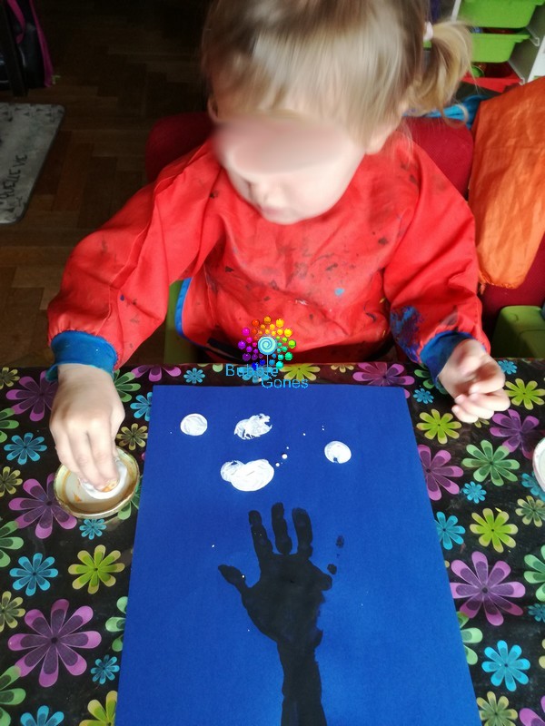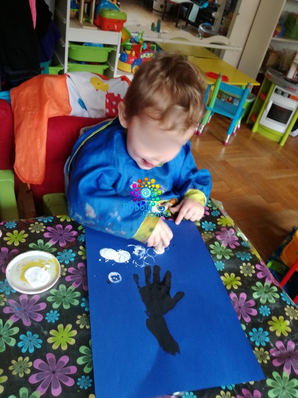 Ils ont alors poser leur main sur la feuille : et hop, voici un bel arbre. Une fois la peinture sèche, Hugo et Jeanne ont tamponné la feuille avec de la peinture blanche et un bouchon.