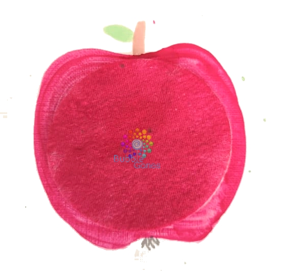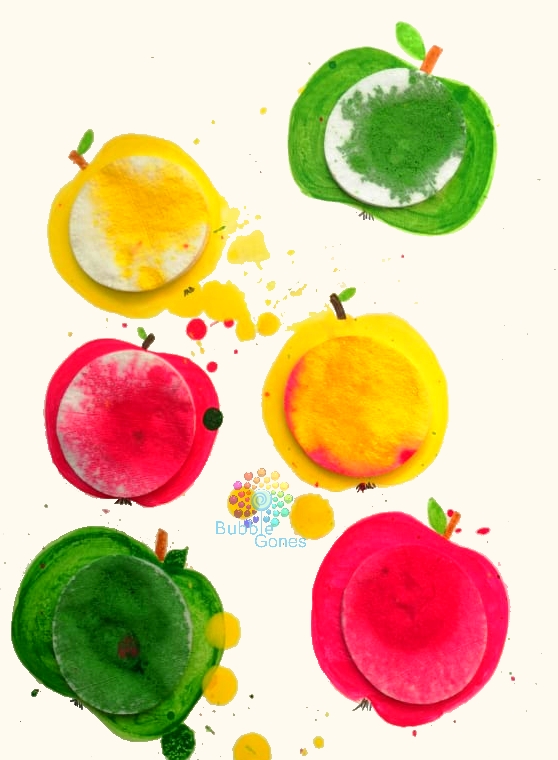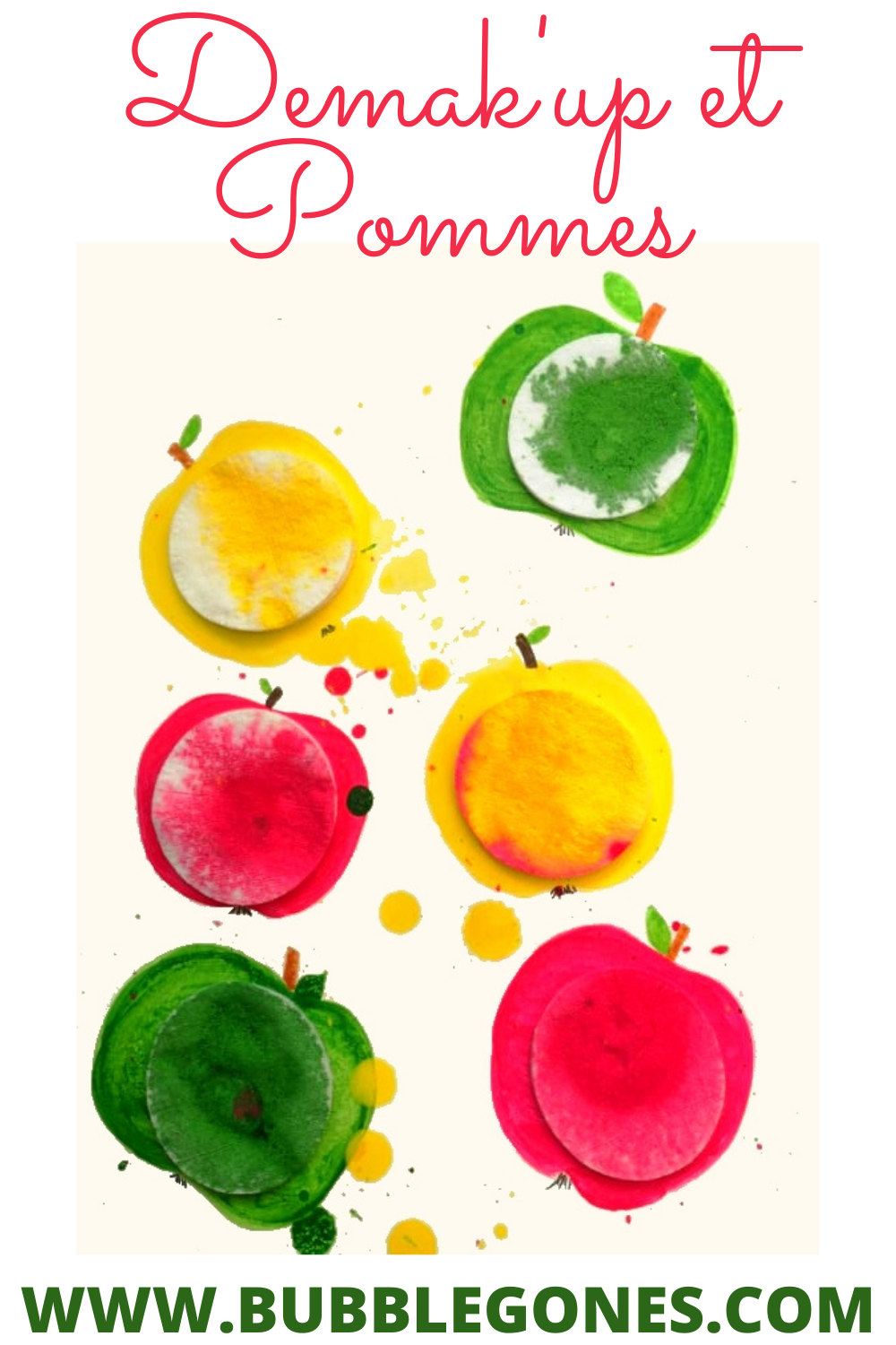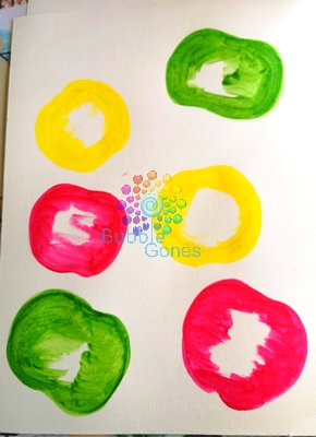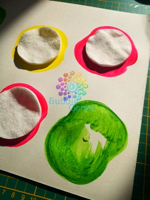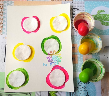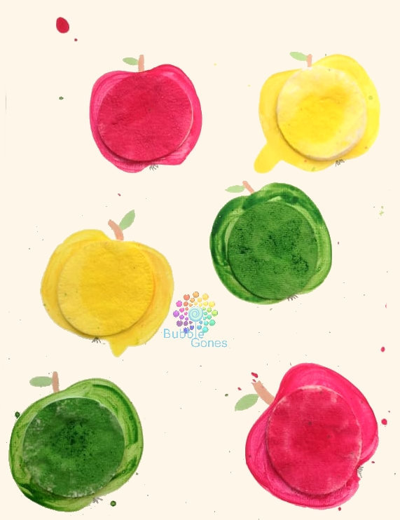 J’ai peint autour des cotons la forme d’une pomme : 2 rouges, 2 vertes et 2 jaunes.