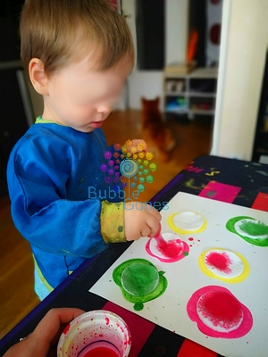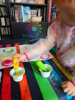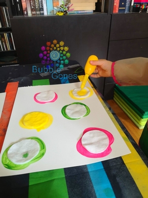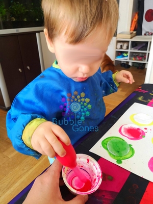En attendant que cela sèche, j’ai préparé ma peinture mélangée avec un peu d’eau. J’ai choisi mes grosses pipettes afin qu’elles soient au couleur de la peinture. Puis j’installe toute l’activité