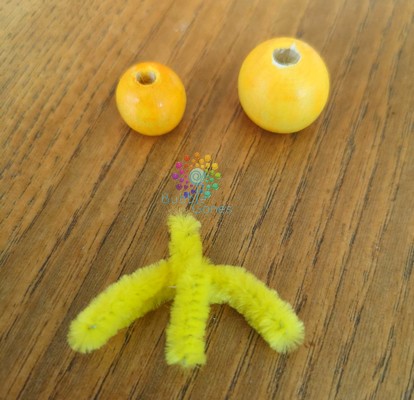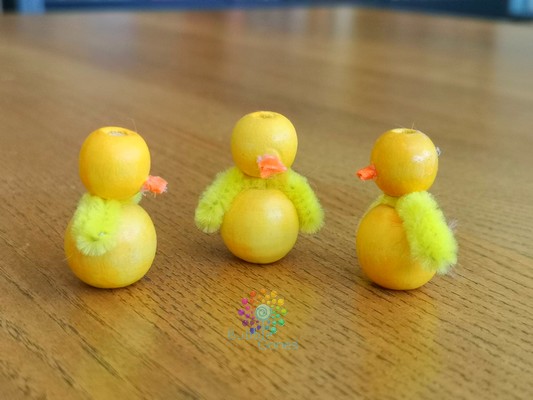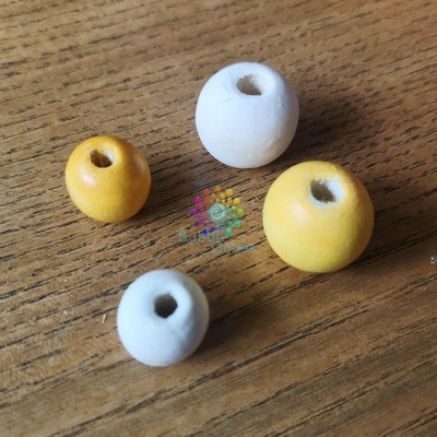 Avec les perles en bois, je vais créer deux personnages de pâques : un lapin et un poussin. Pour chaque animal, je vais utiliser deux perles : une petite pour la tête et une grande pour le ventre.