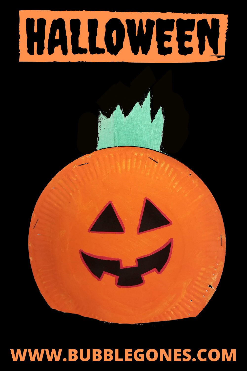 Une fois la peinture sèche, j’ai découpé les yeux et la bouche. Je les ai mis en valeur en repassant le contour en rouge. J’ai découpé la tige de la citrouille dans du papier crépon vert. J’ai agrafé les deux assiettes entre elles.