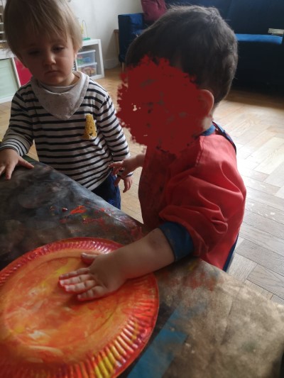 Les garçons sont de plus en fan de manipuler la peinture avec les mains, c’est une texture agréable à toucher. Mais surtout ça leur permet de se rendre compte de l’effet direct de leur main sur la peinture : l’étaler et effacer le blanc.