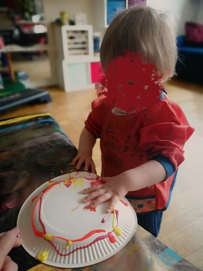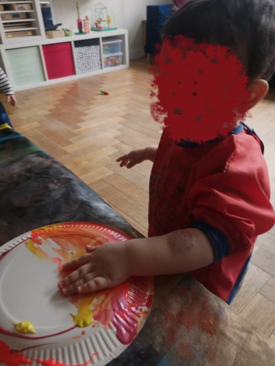 je dépose des gouttes de peinture sur toute l’assiette en carton et je laisse l’enfant l’étaler à sa guise. J’ai mis trois couleurs : jaune, orange et rouge. Ce sont les peintures d’Action, elles sont légèrement métallisées.