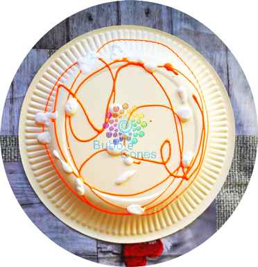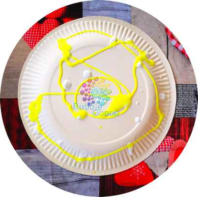Je dépose des filets de peinture sur l’assiette en carton : un mélange de jaune et de blanc pour obtenir un effet clair et lumineux.