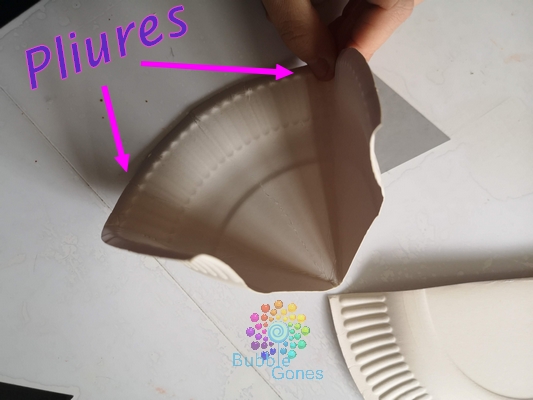 Pour ce tuto, vous avez besoin d’une demi assiette en carton. Je l’ai découpé en deux, puis j’ai plié cette demi assiette en trois. J’ai collé les deux extrémité ensemble pour former une pyramide :
