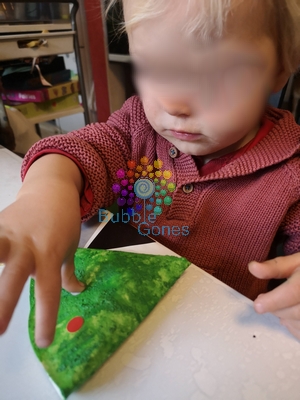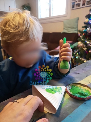 Lorsque la peinture a été sèche, ils ont orné leur sapin de boules de Noël en collant des gommettes. ça été leur première expérience avec les gommettes. C’est pas toujours facile, car les gommettes collent aux petits doigts. Je leur décolle la gommette et je leur colle celle-ci sur le rebord de la table. Ainsi ils peuvent la récupérer et essayer de la coller sur le sapin.